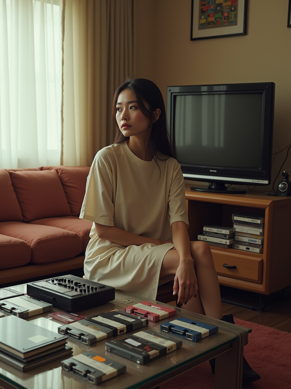 model in a 90s living room, wearing a slip dress over a t-shirt with combat boots , sitting next to a boombox with dual cassette decks, collection of mixtapes spread on a glass coffee table, VHS tapes stacked by a tube TV