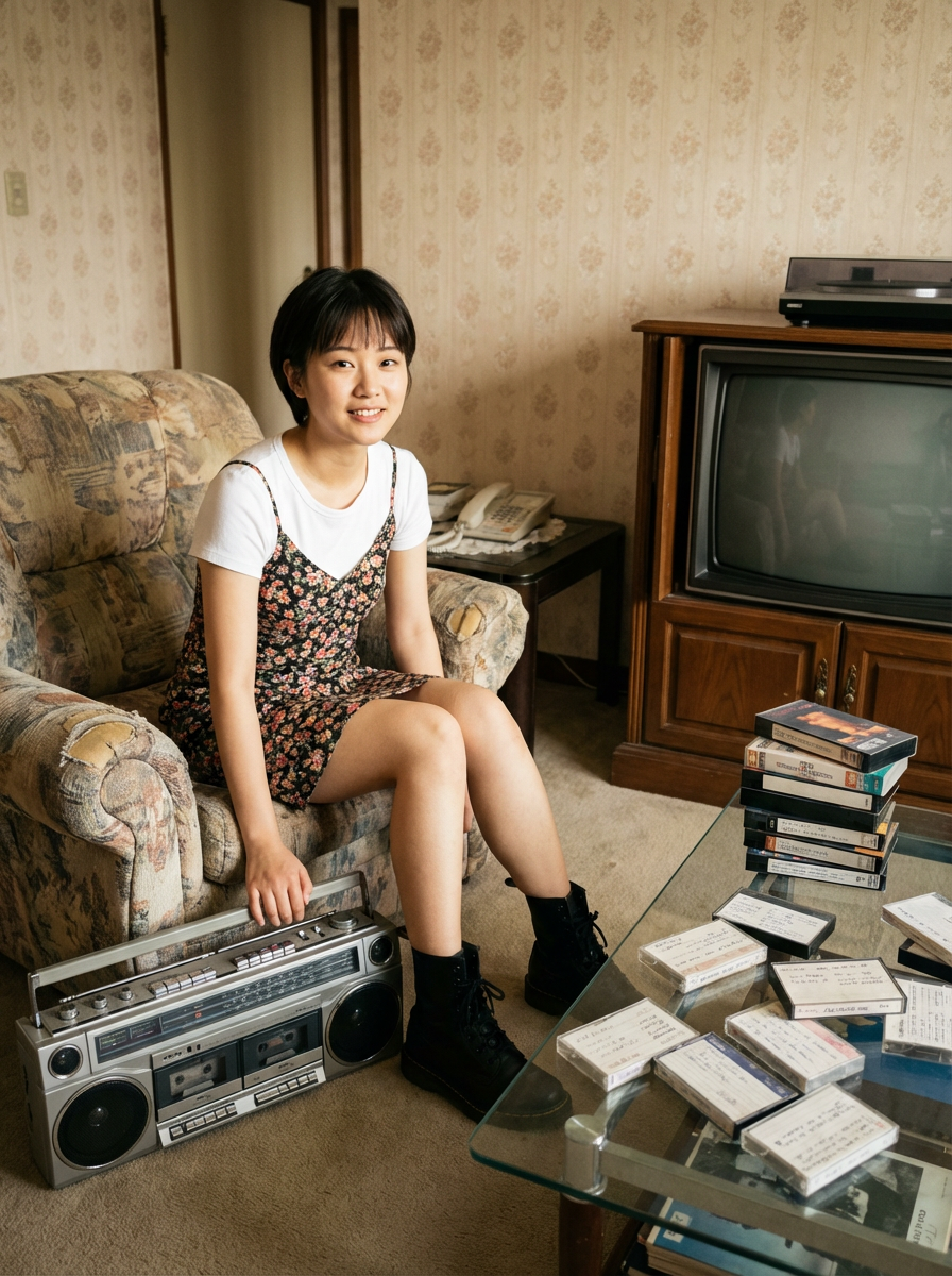 model in a 90s living room, wearing a slip dress over a t-shirt with combat boots , sitting next to a boombox with dual cassette decks, collection of mixtapes spread on a glass coffee table, VHS tapes stacked by a tube TV