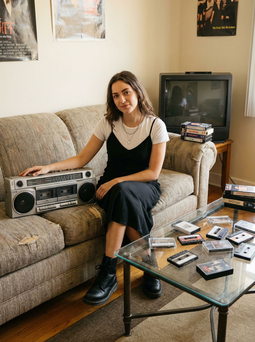 model in a 90s living room, wearing a slip dress over a t-shirt with combat boots , sitting next to a boombox with dual cassette decks, collection of mixtapes spread on a glass coffee table, VHS tapes stacked by a tube TV