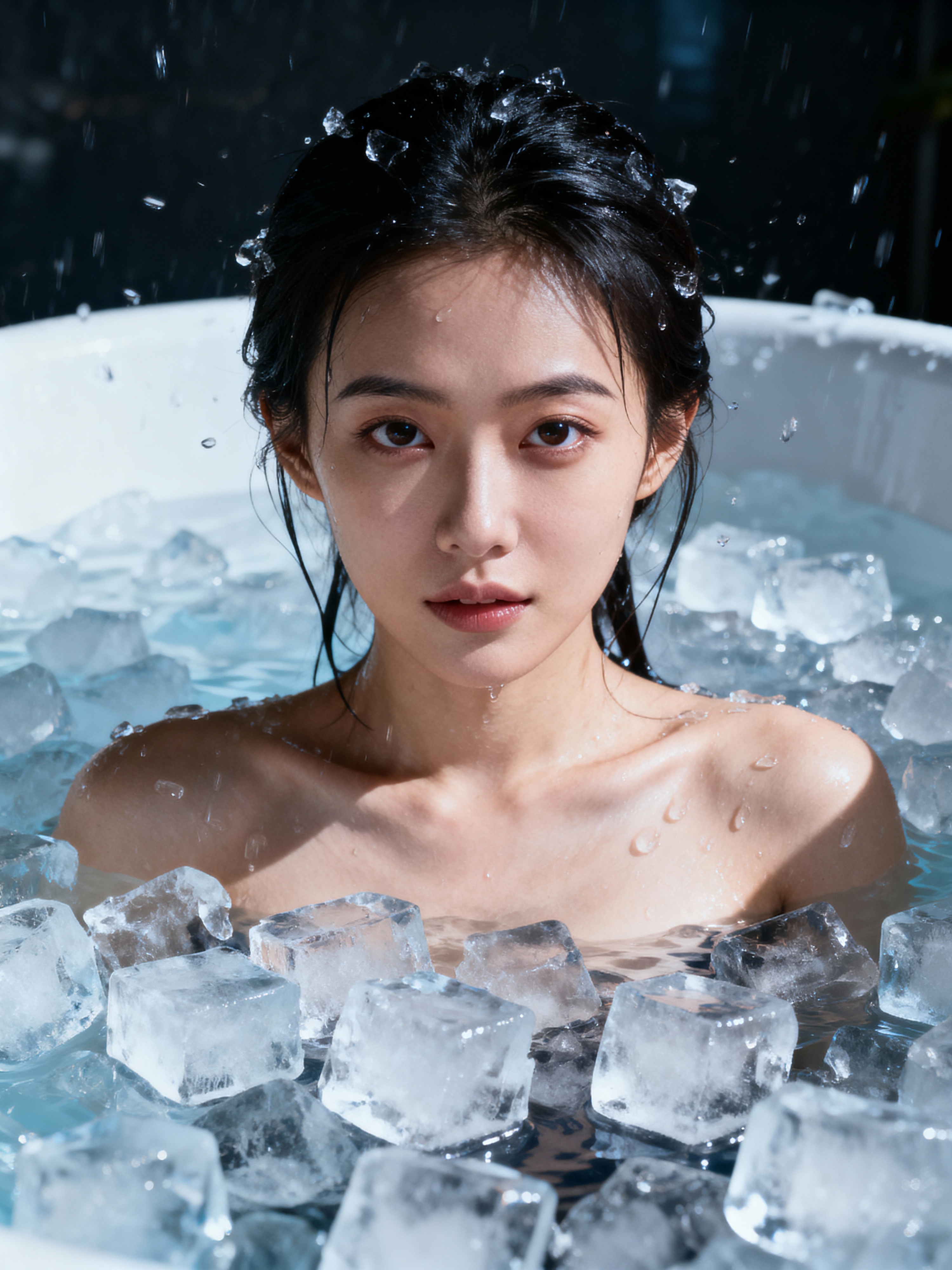 model in a bath of ice cubes
