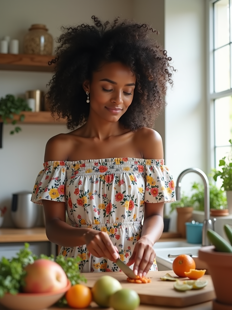 model in a bright kitchen preparing a homemade meal, wearing a floral off-the-shoulder smocked dress, hair in soft curls, with pearl earrings
