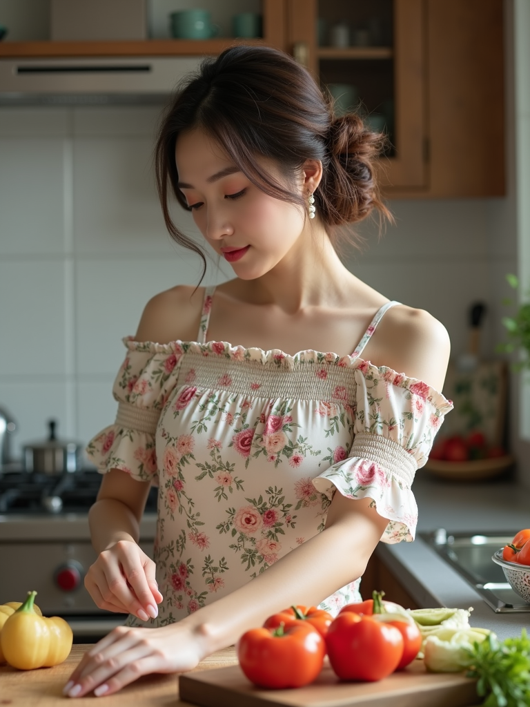 model in a bright kitchen preparing a homemade meal, wearing a floral off-the-shoulder smocked dress, hair in soft curls, with pearl earrings