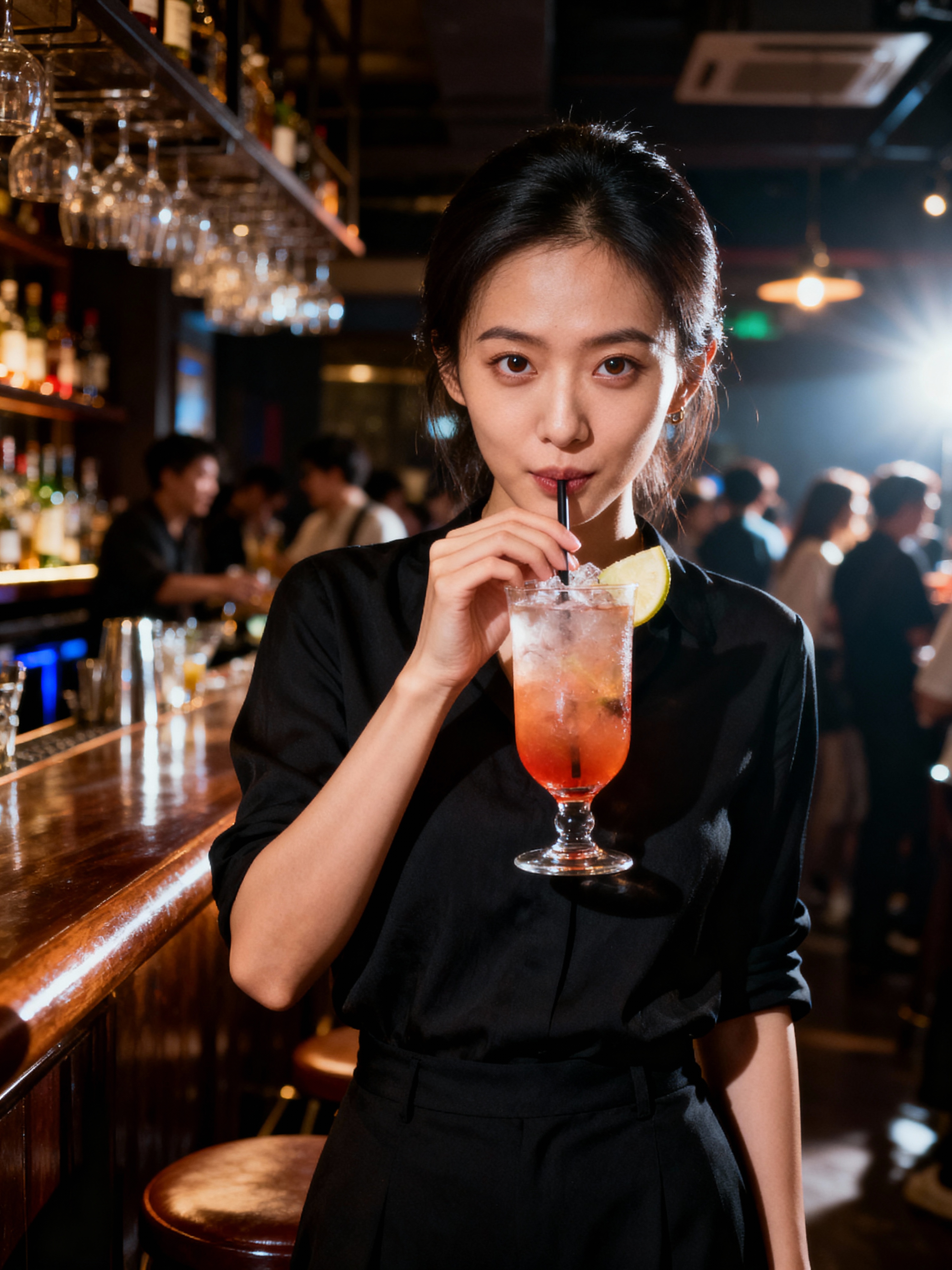 model in a busy bar drinking mocktail. holding an intact glass mocktail