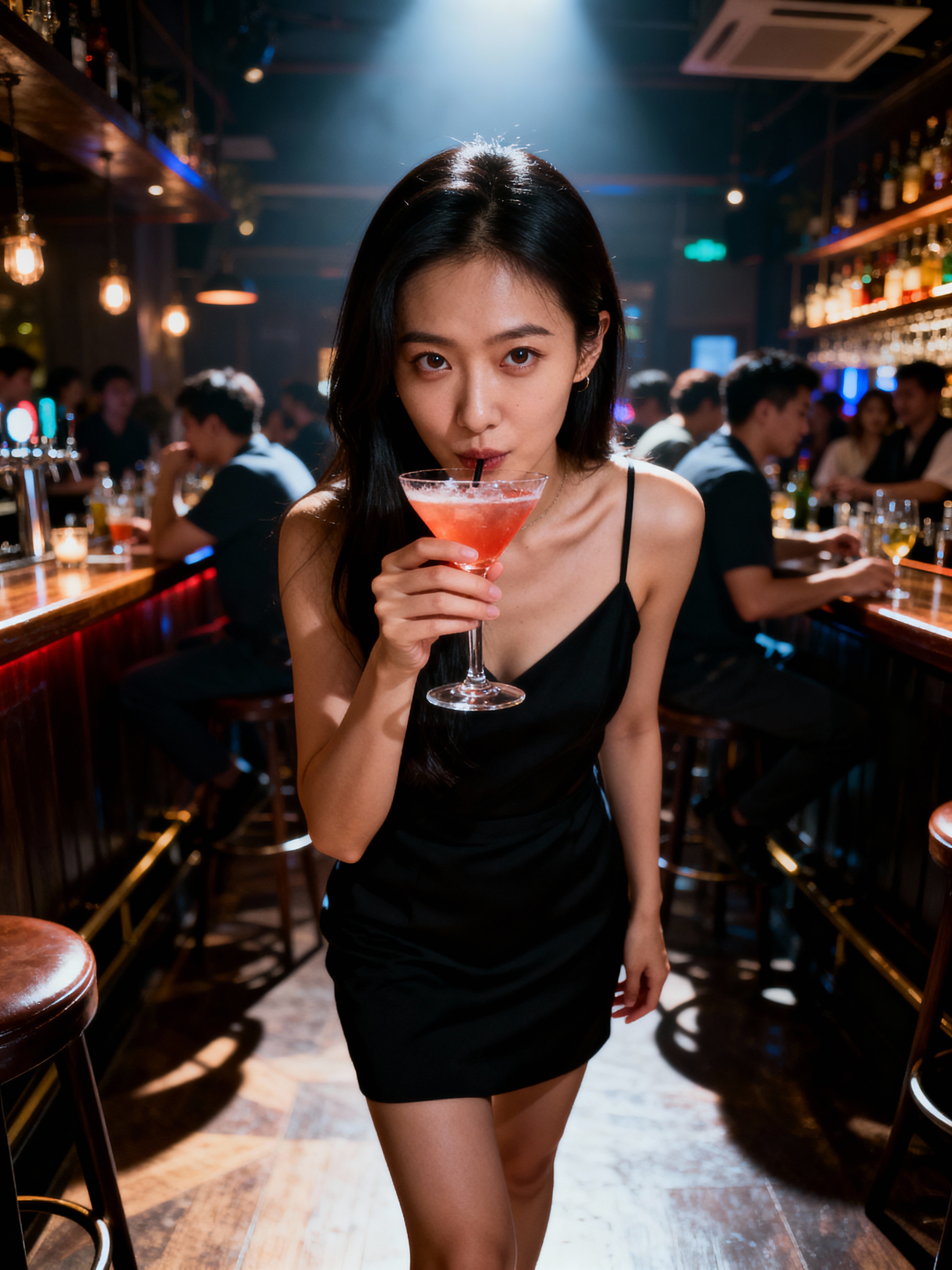 model in a busy bar drinking mocktail. holding an intact glass mocktail
