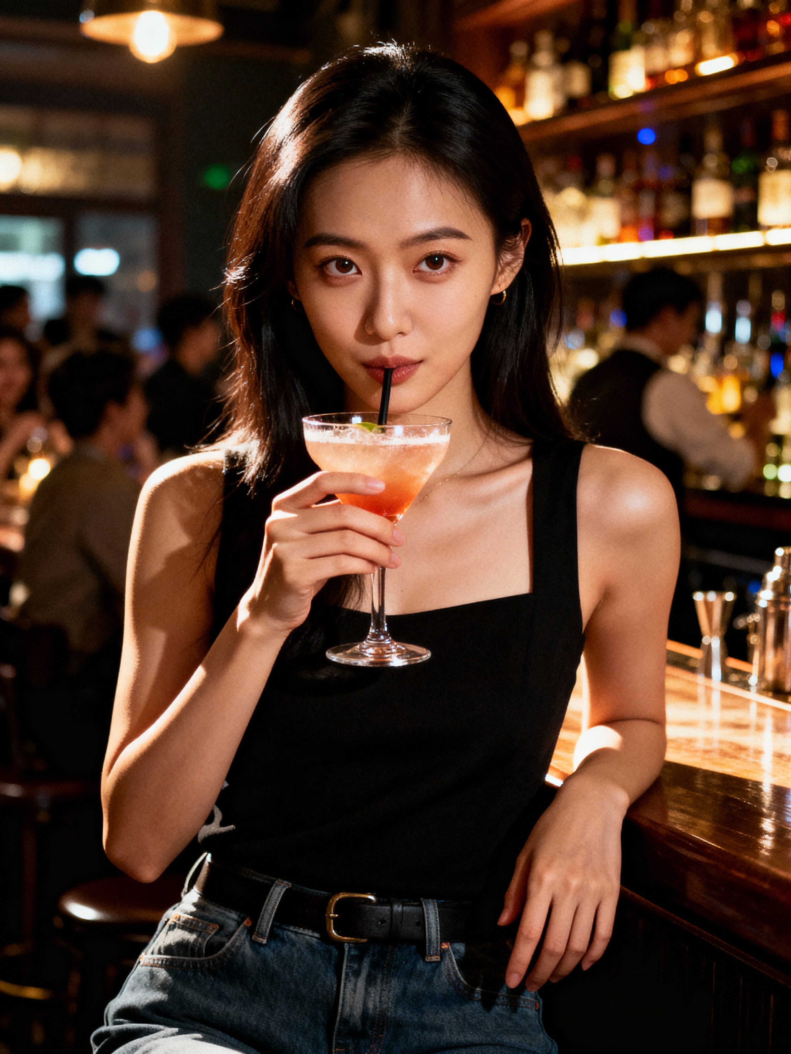 model in a busy bar drinking mocktail. holding an intact glass mocktail