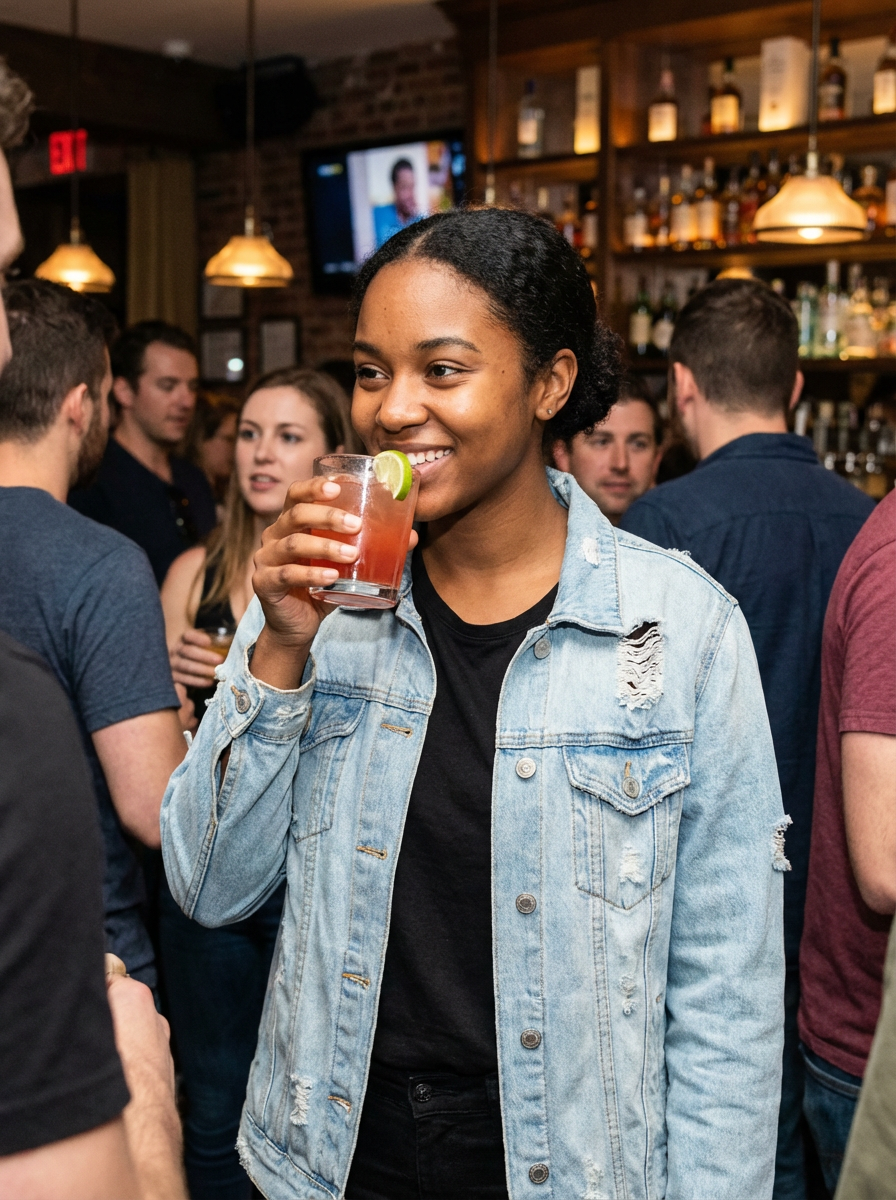 model in a busy bar drinking mocktail. holding an intact glass mocktail