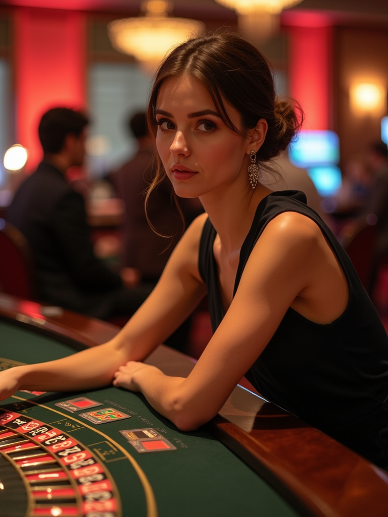 model in a casino at the Roulette table. at night. the model is dressed in a chic and polished outfit, such as an elegant gown or tailored dress.