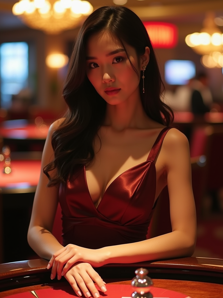 model in a casino at the Roulette table. at night. the model is dressed in a chic and polished outfit, such as an elegant gown or tailored dress.