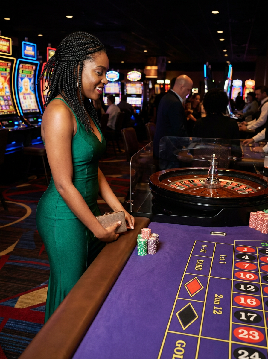 model in a casino at the Roulette table. at night. the model is dressed in a chic and polished outfit, such as an elegant gown or tailored dress.