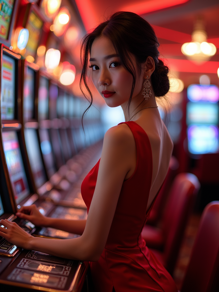 model in a casino at the Slot Machines. at night. the model is dressed in a chic and polished outfit, such as an elegant gown or tailored dress.