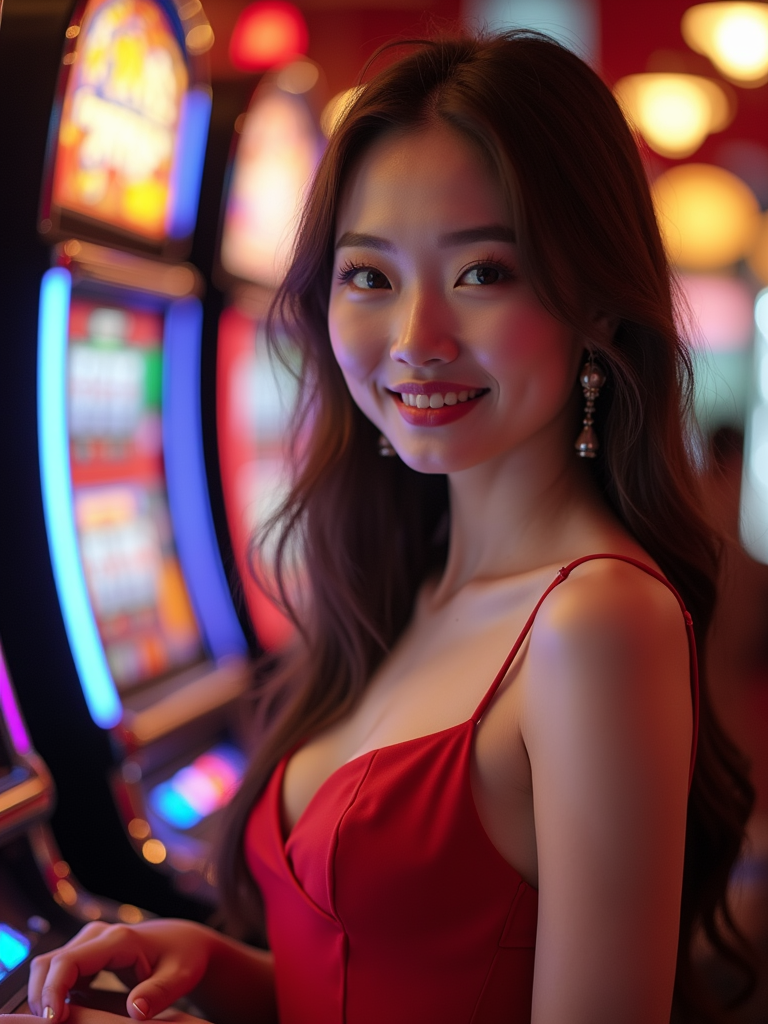 model in a casino at the Slot Machines. at night. the model is dressed in a chic and polished outfit, such as an elegant gown or tailored dress.