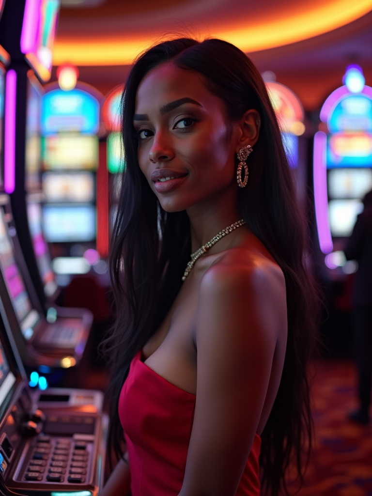model in a casino at the Slot Machines. at night. the model is dressed in a chic and polished outfit, such as an elegant gown or tailored dress.