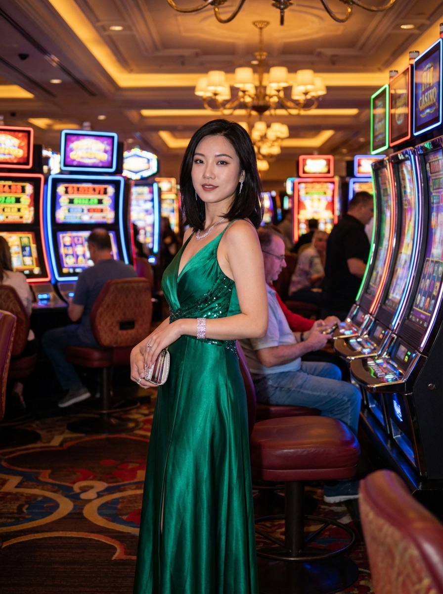 model in a casino at the Slot Machines. at night. the model is dressed in a chic and polished outfit, such as an elegant gown or tailored dress.