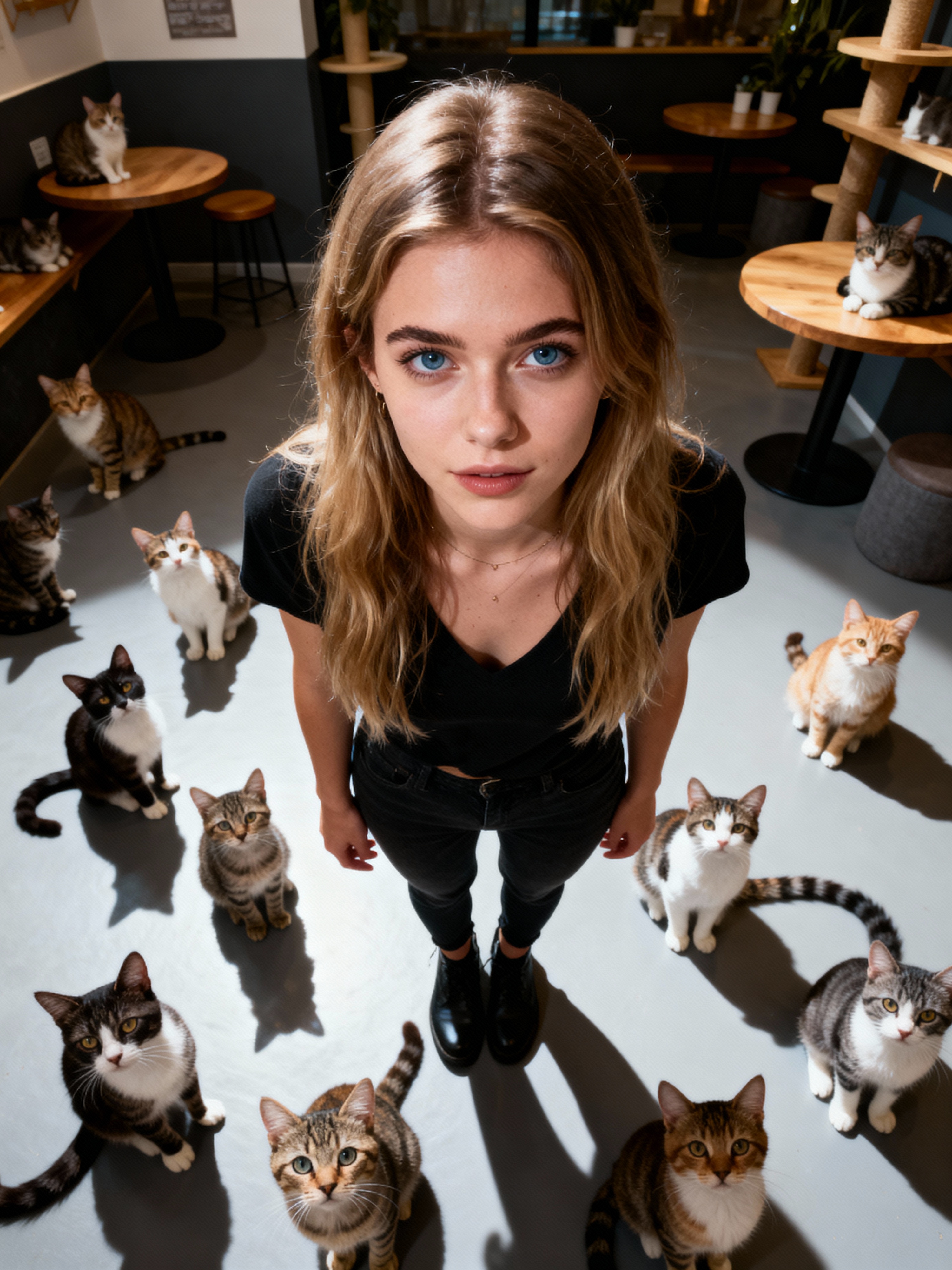 model in a Cat Cafe with many cute Cats and Kittens around them