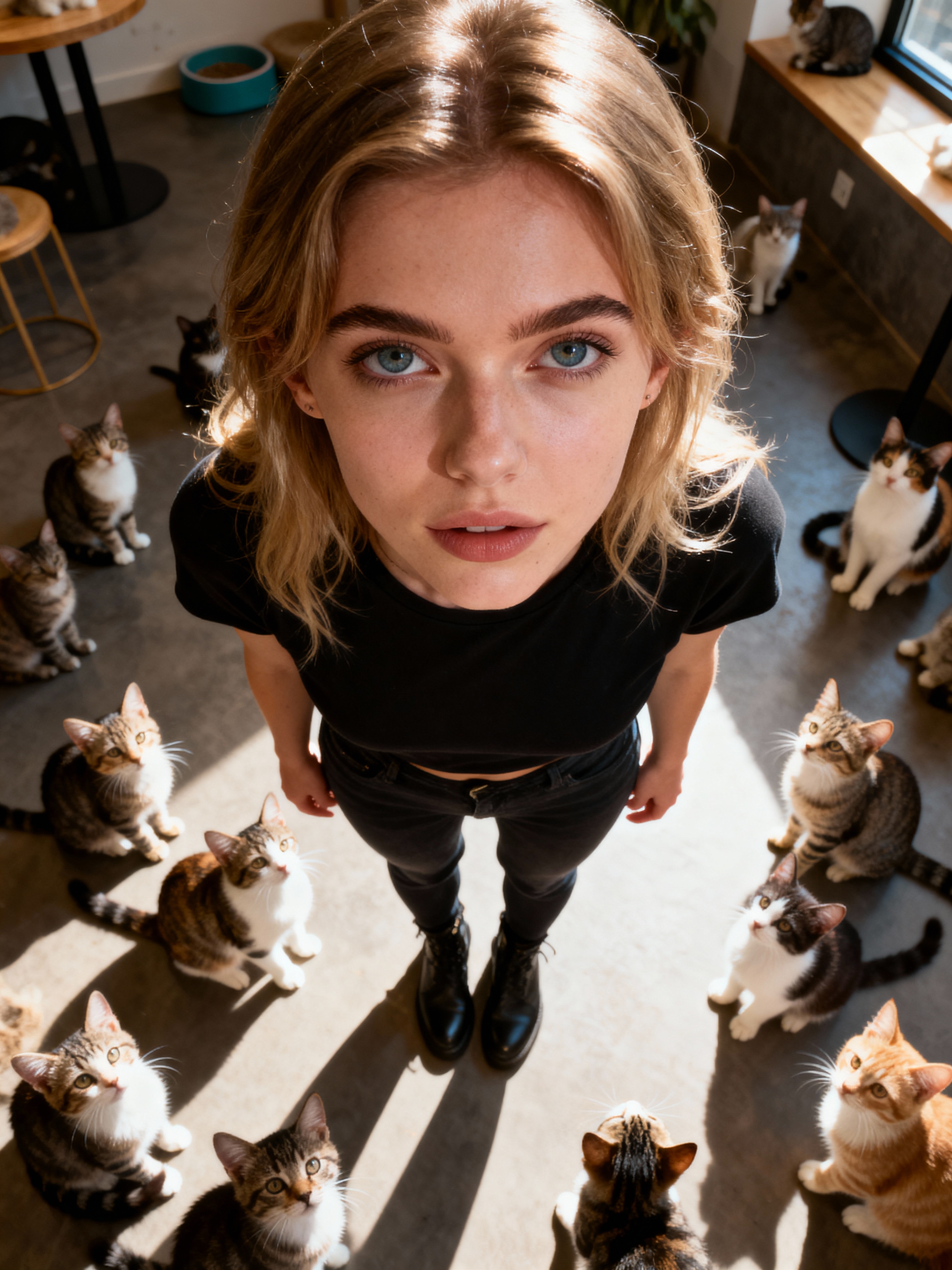 model in a Cat Cafe with many cute Cats and Kittens around them