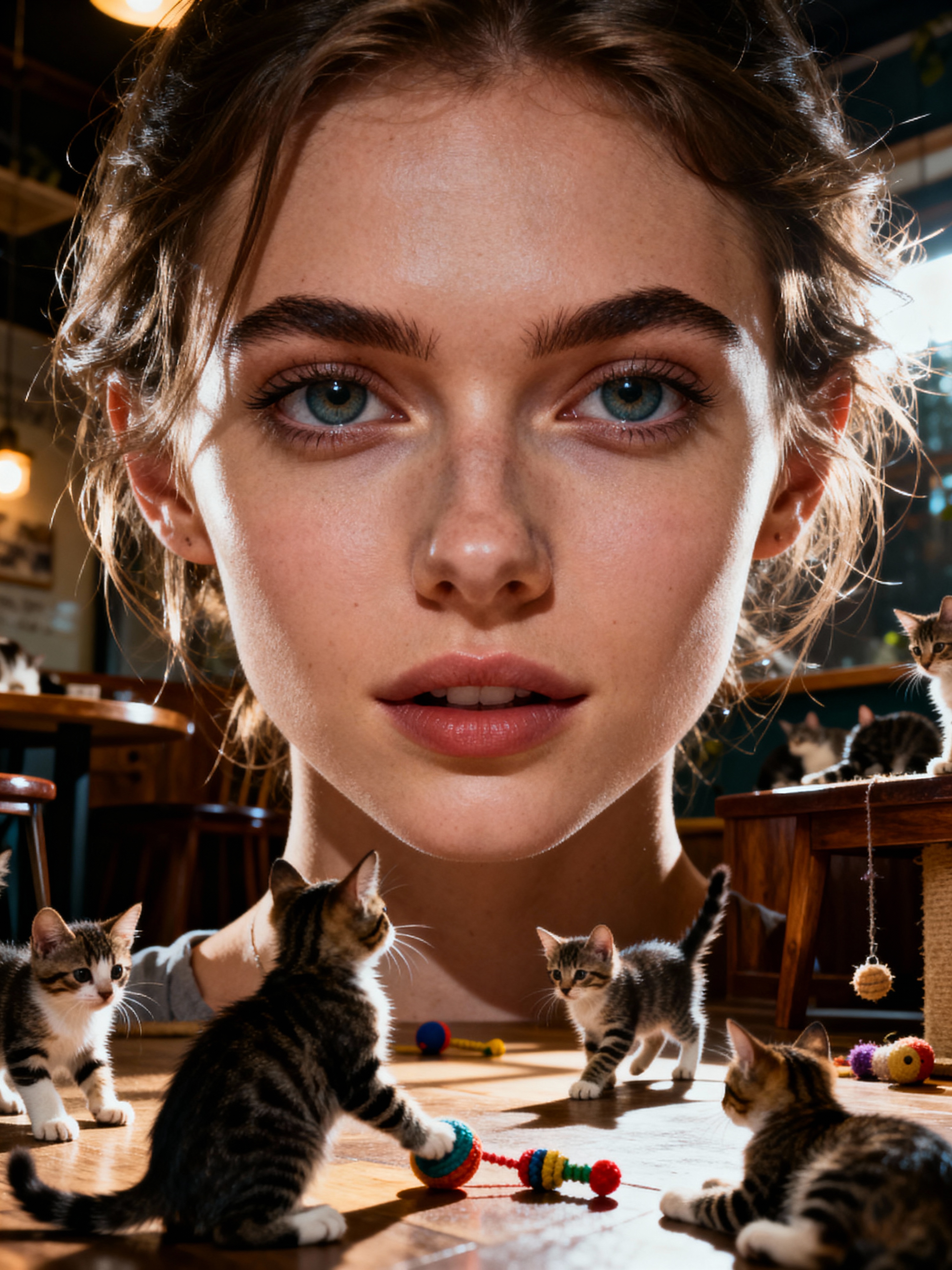 model in a Cat Cafe with many cute Cats and Kittens around them