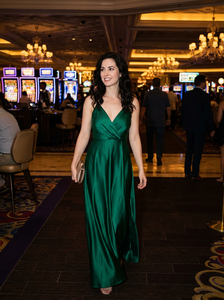 model in a classic Las Vegas casino, like Caesars Palace or Bellagio. at night. the model is dressed in a chic and polished outfit, such as an elegant gown or tailored dress.
