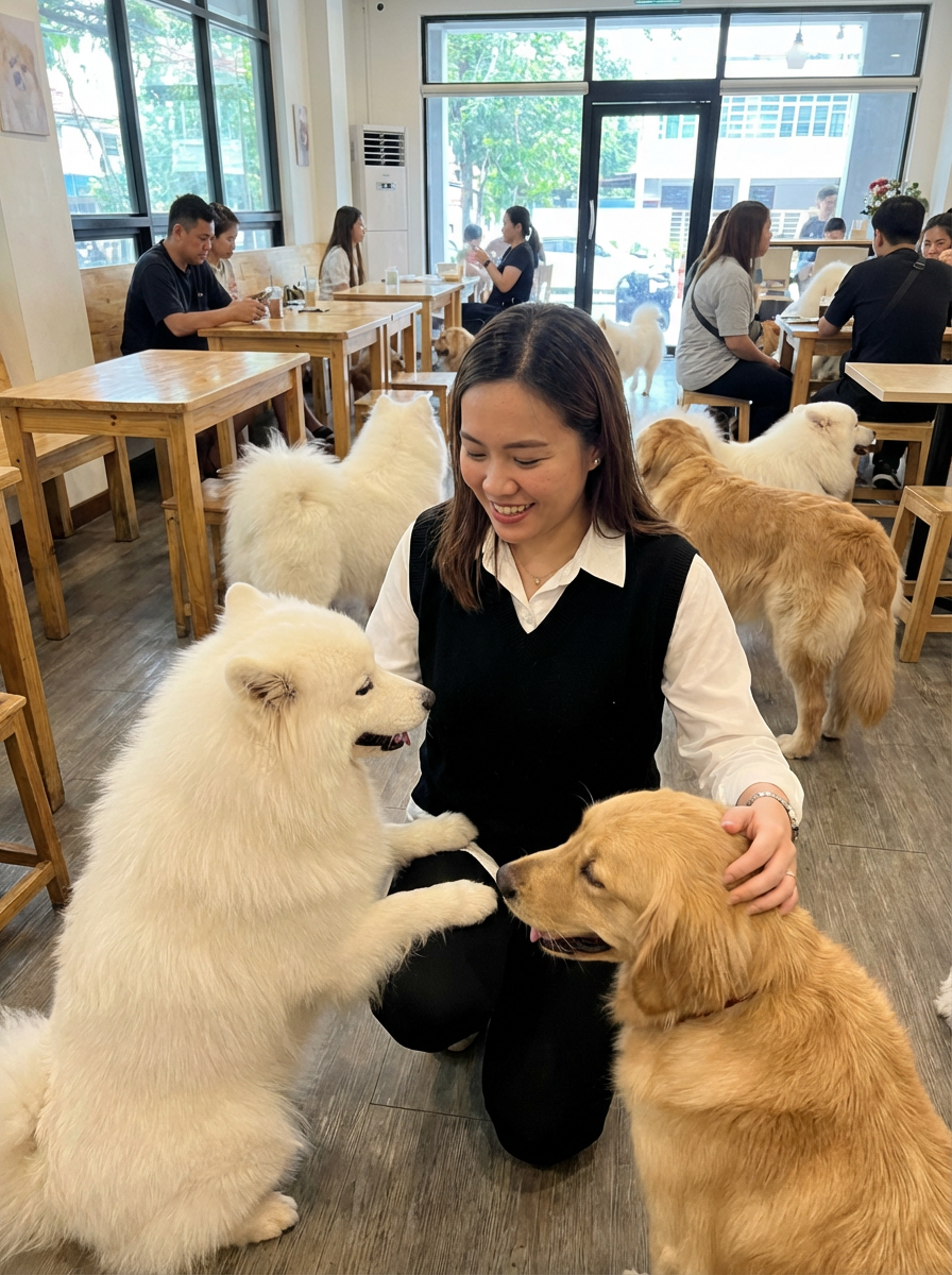 model in a Dog Cafe with many cute Samoyed and Golden Retriever dogs