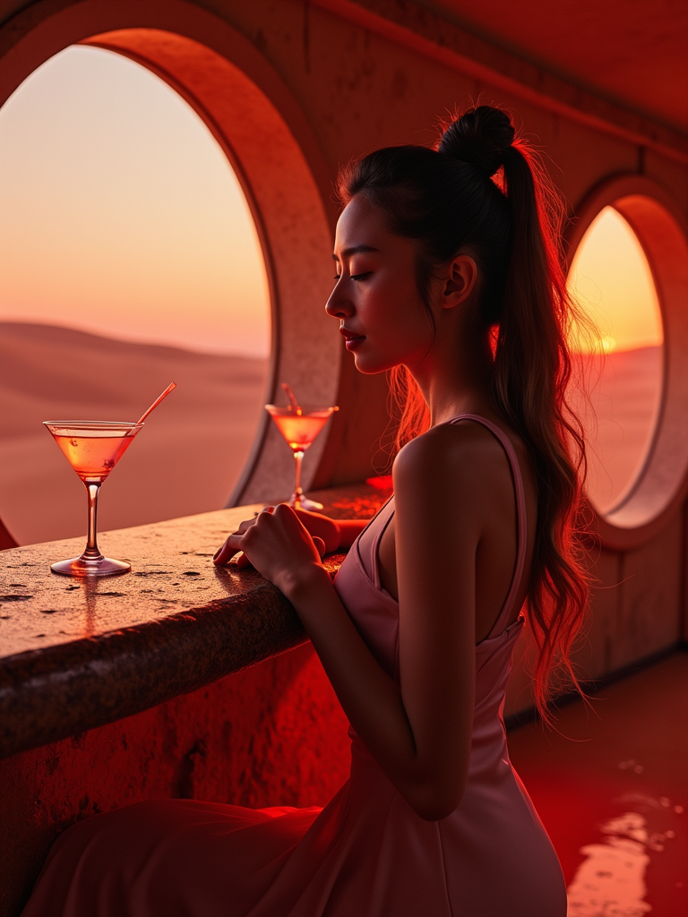 model in a futuristic coktail bar on Mars. at night. indoors with futuristic interior. Mars red dunes is visible in big windows. model wears an elegant dress.
