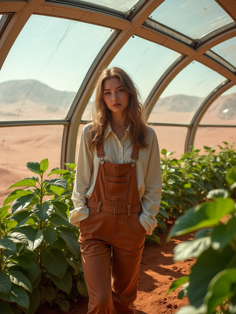 model in a futuristic geodesic dome growing plants, fruits and vegetables on Mars, with the Mars red dunes visible in windows. model wears overalls and a long-sleeve shirt.