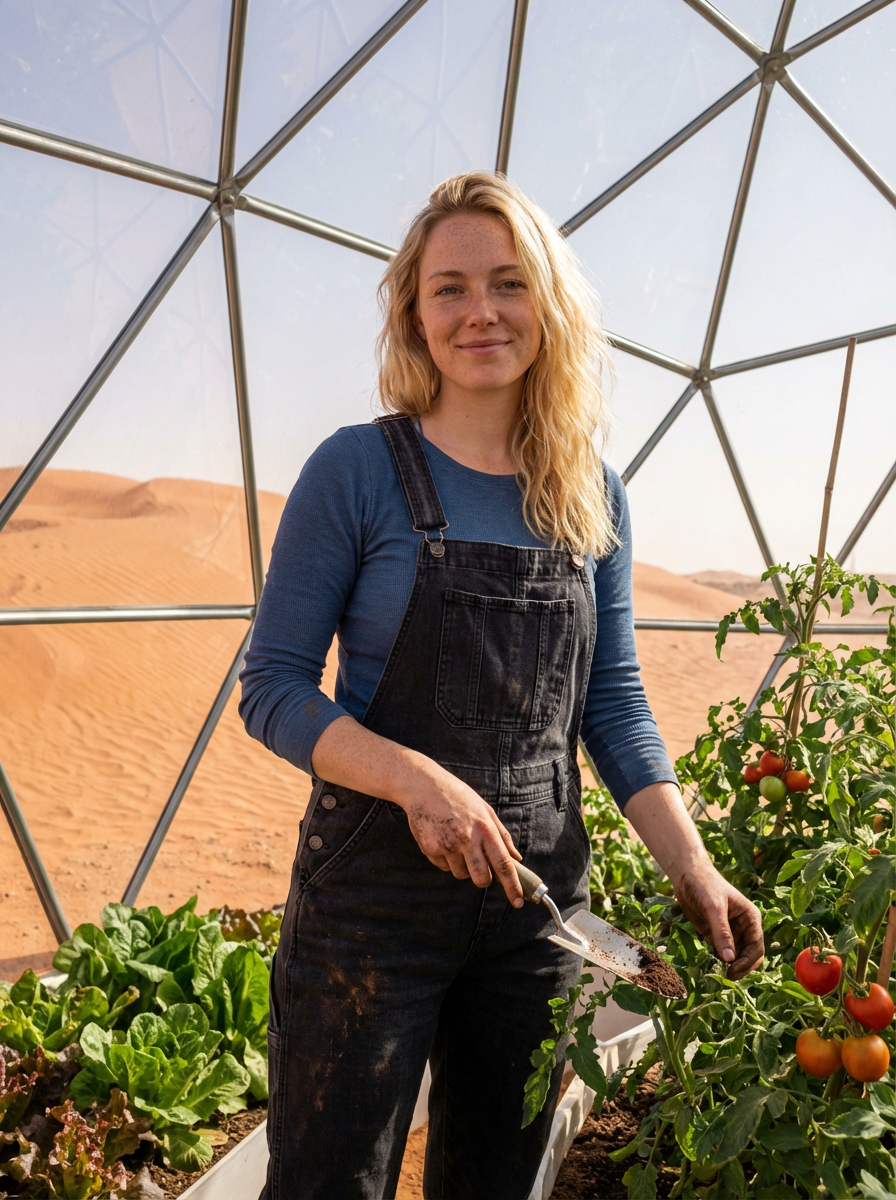 model in a futuristic geodesic glass dome growing plants, fruits and vegetables on Mars, with the Mars red dunes visible in windows. model wears overalls and a long-sleeve shirt.