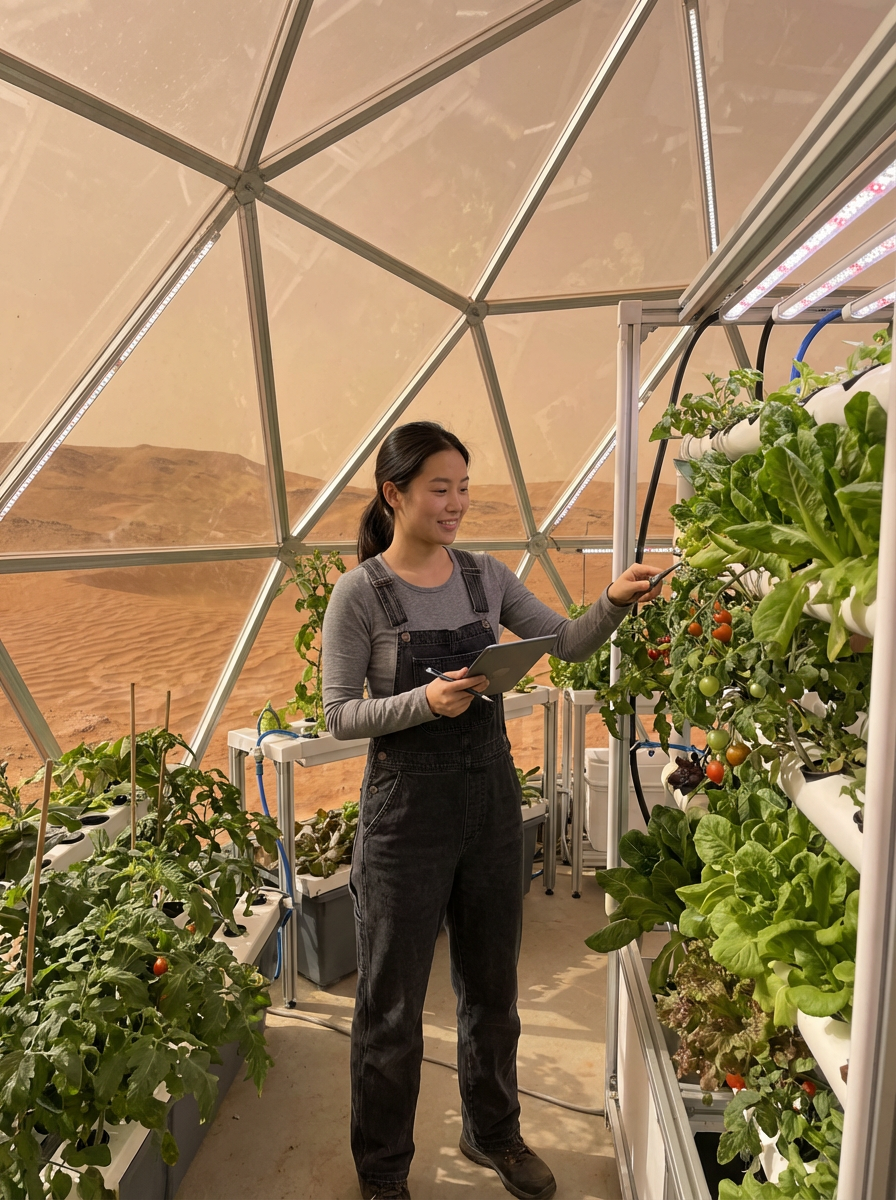 model in a futuristic geodesic glass dome growing plants, fruits and vegetables on Mars, with the Mars red dunes visible in windows. model wears overalls and a long-sleeve shirt.