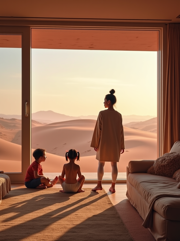 model in a futuristic living room with children playing. Mars red dunes is visible in big windows. model wears a relaxed cardigan and leggings.