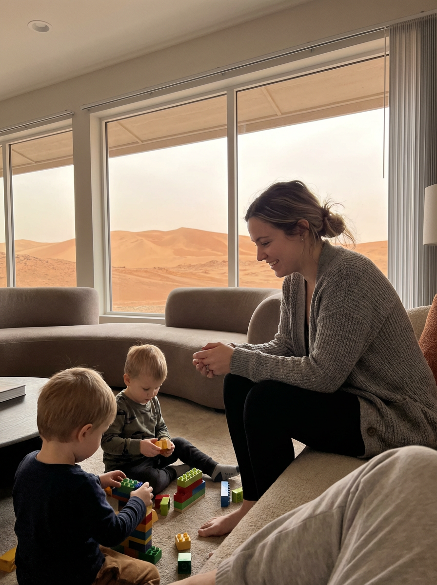 model in a futuristic living room with children playing. Mars red dunes is visible in big windows. model wears a relaxed cardigan and leggings.