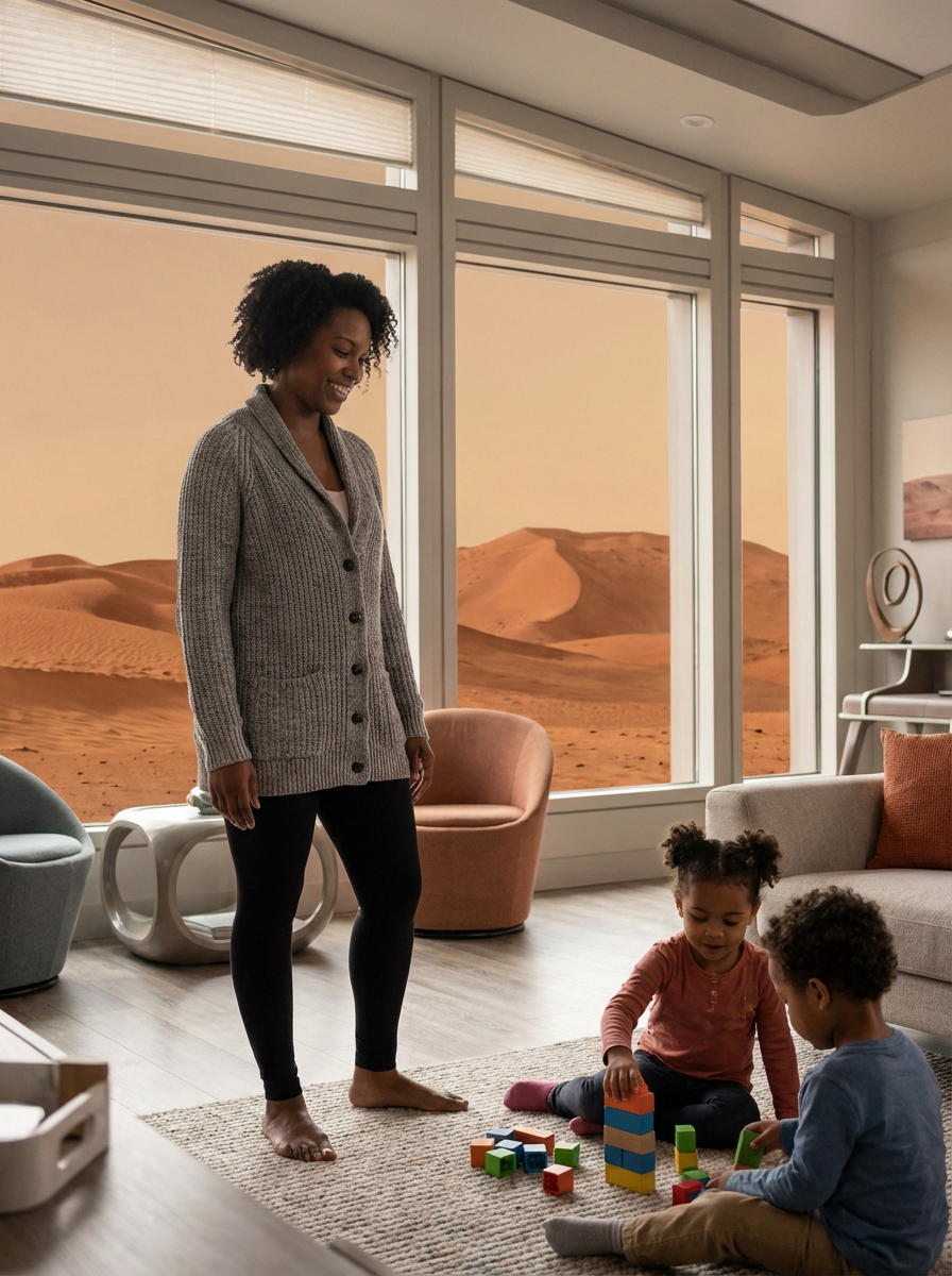 model in a futuristic living room with children playing. Mars red dunes is visible in big windows. model wears a relaxed cardigan and leggings.