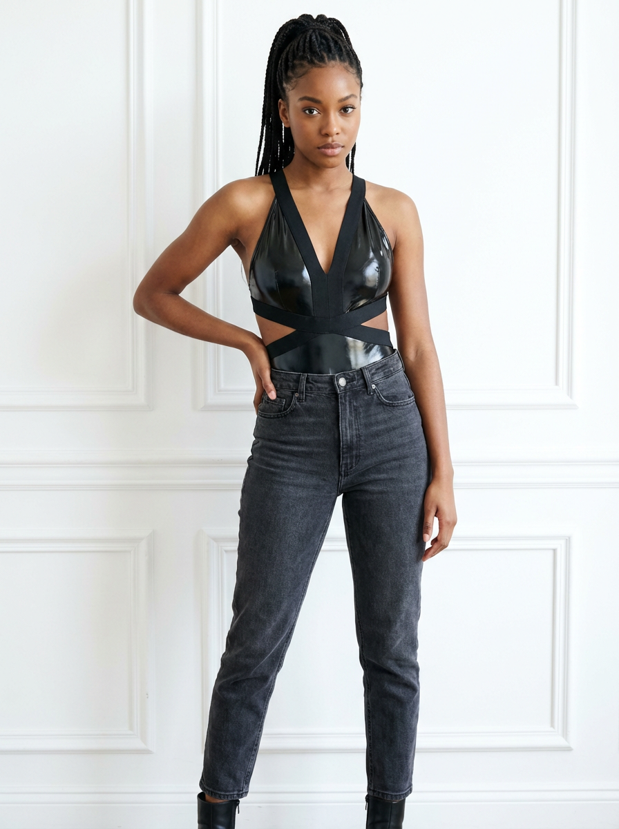 model in a glossy black halter-cut bodysuit with thick straps creating a bold v-shape across her chest and waist. standing in front of white molding walls, she places one hand on her hip, looking directly at the viewer. lighting is bright and clean.