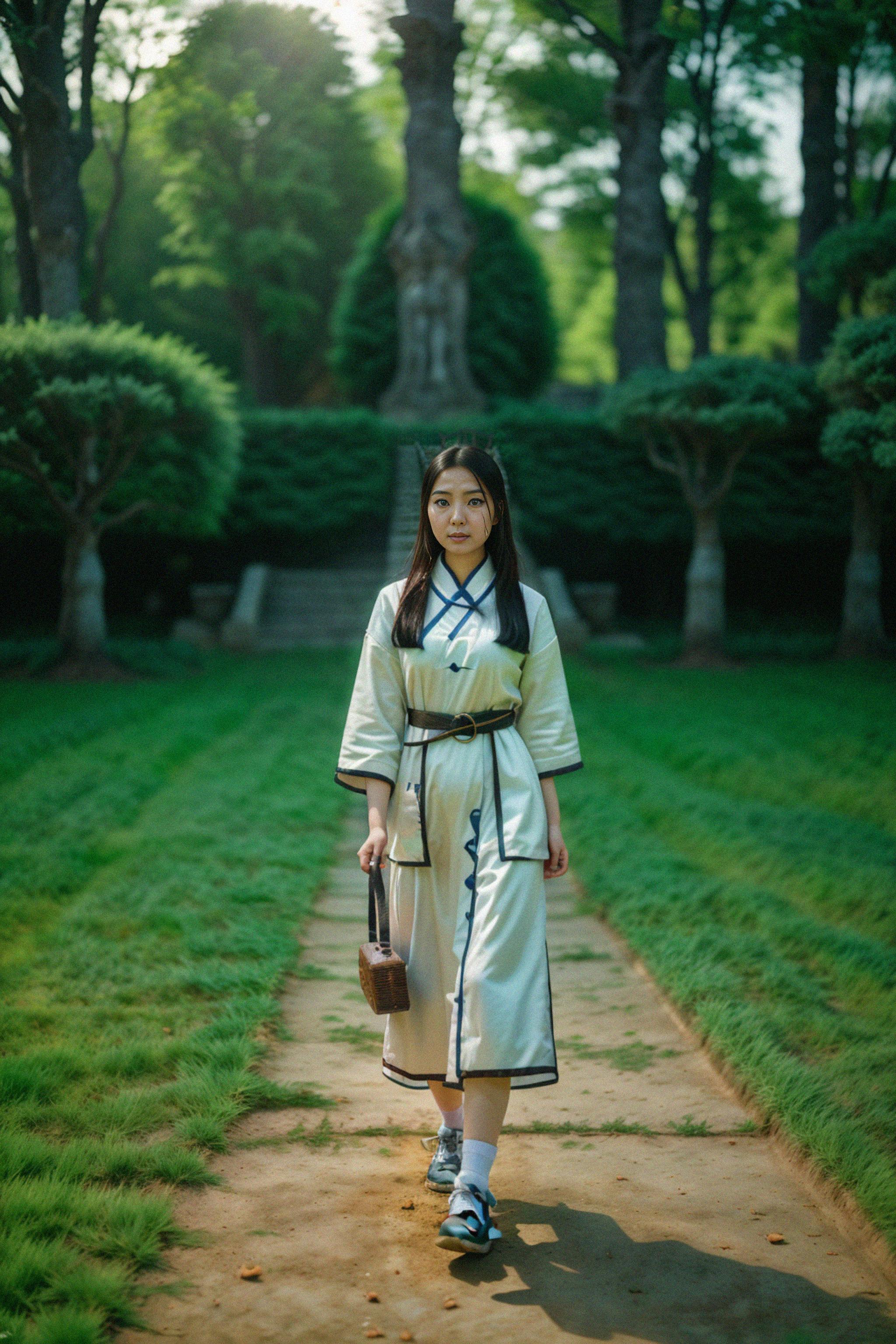 model in a labyrinth or walking a sacred path, symbolizing the journey of self-discovery and spiritual awakening