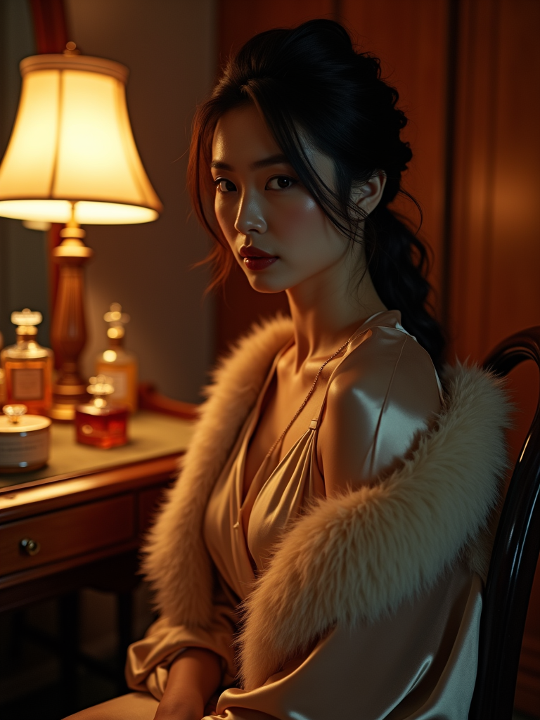 model in a luxurious boudoir setting, wearing a silk robe with fur trim , sitting at vanity with vintage perfume bottles , dramatic lighting from a single lamp, film noir chiaroscuro effect