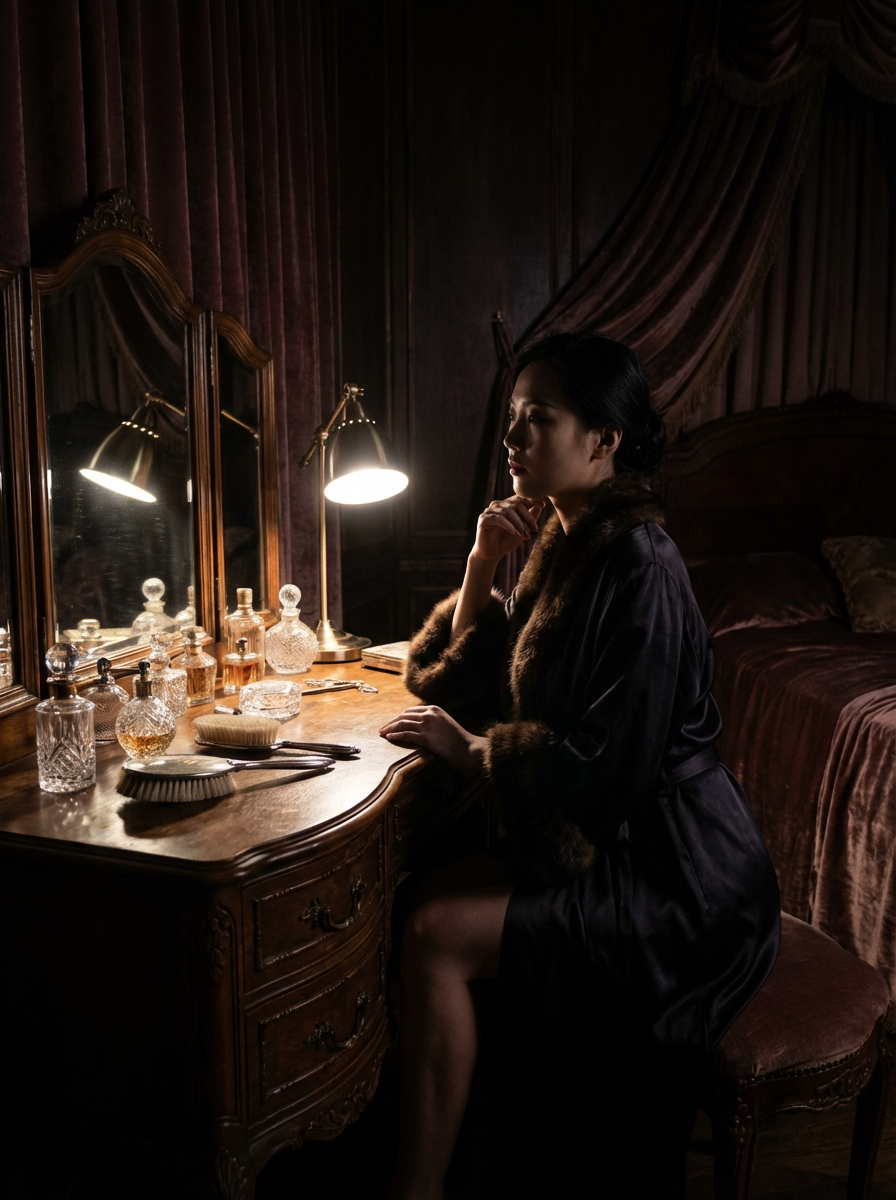 model in a luxurious boudoir setting, wearing a silk robe with fur trim , sitting at vanity with vintage perfume bottles , dramatic lighting from a single lamp, film noir chiaroscuro effect