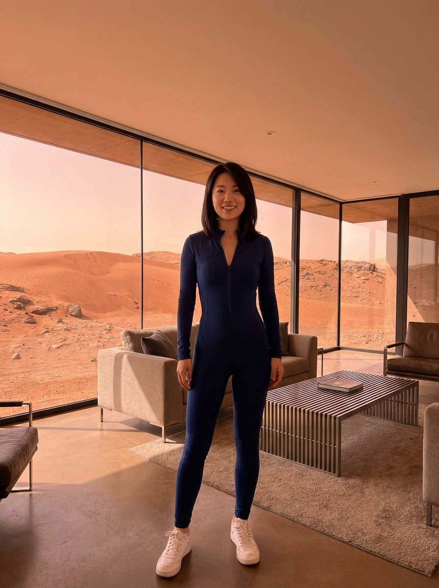 model in a modern living room on Mars with the Mars red dunes visible in the big windows. model wears a fitted jumpsuit with sneakers.