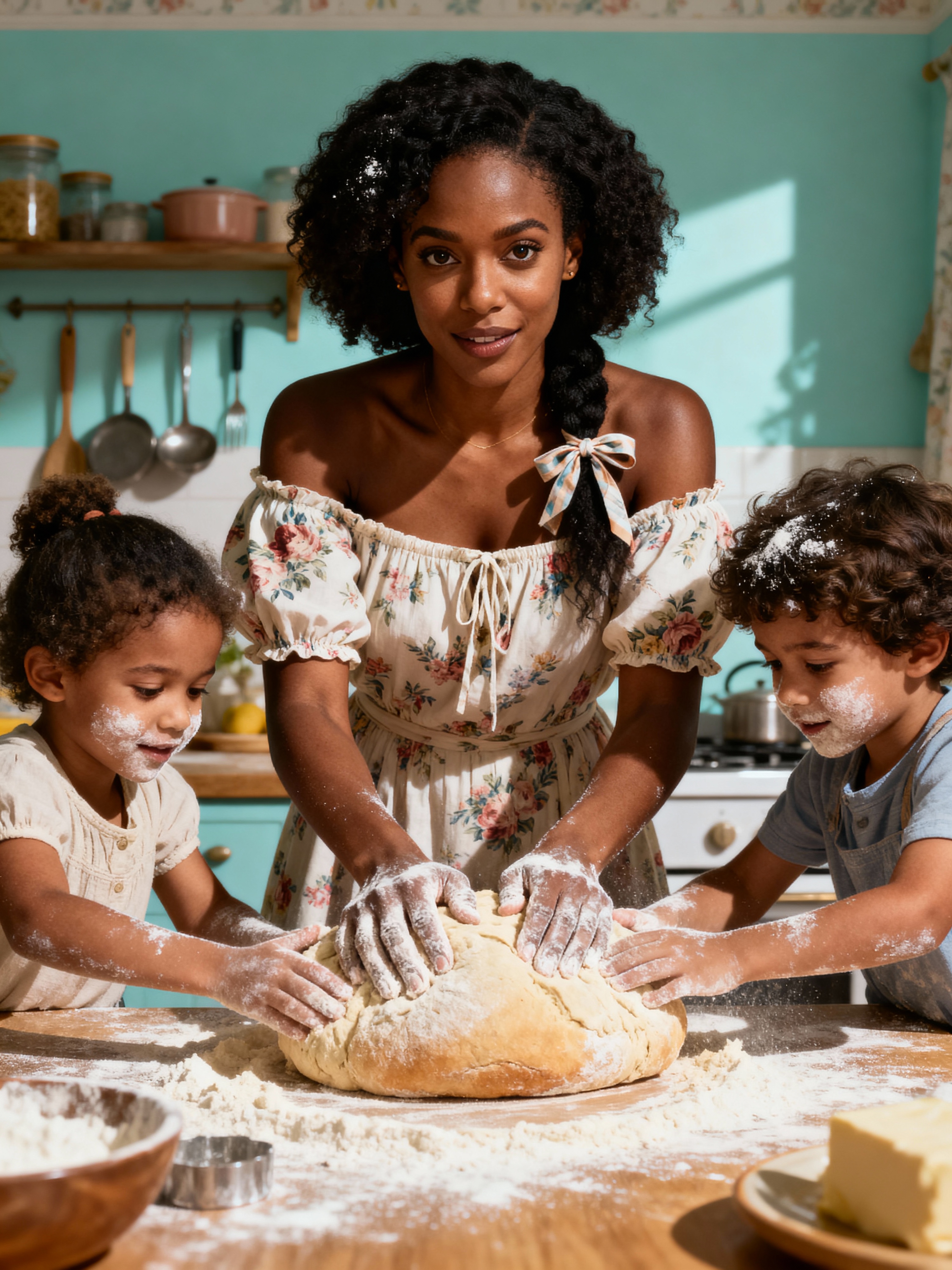 model in a quaint, pastel-painted kitchen baking homemade bread with her two young children helping knead dough, wearing a floral off-the-shoulder smocked dress, hair tied with a ribbon, flour on hands and children's faces