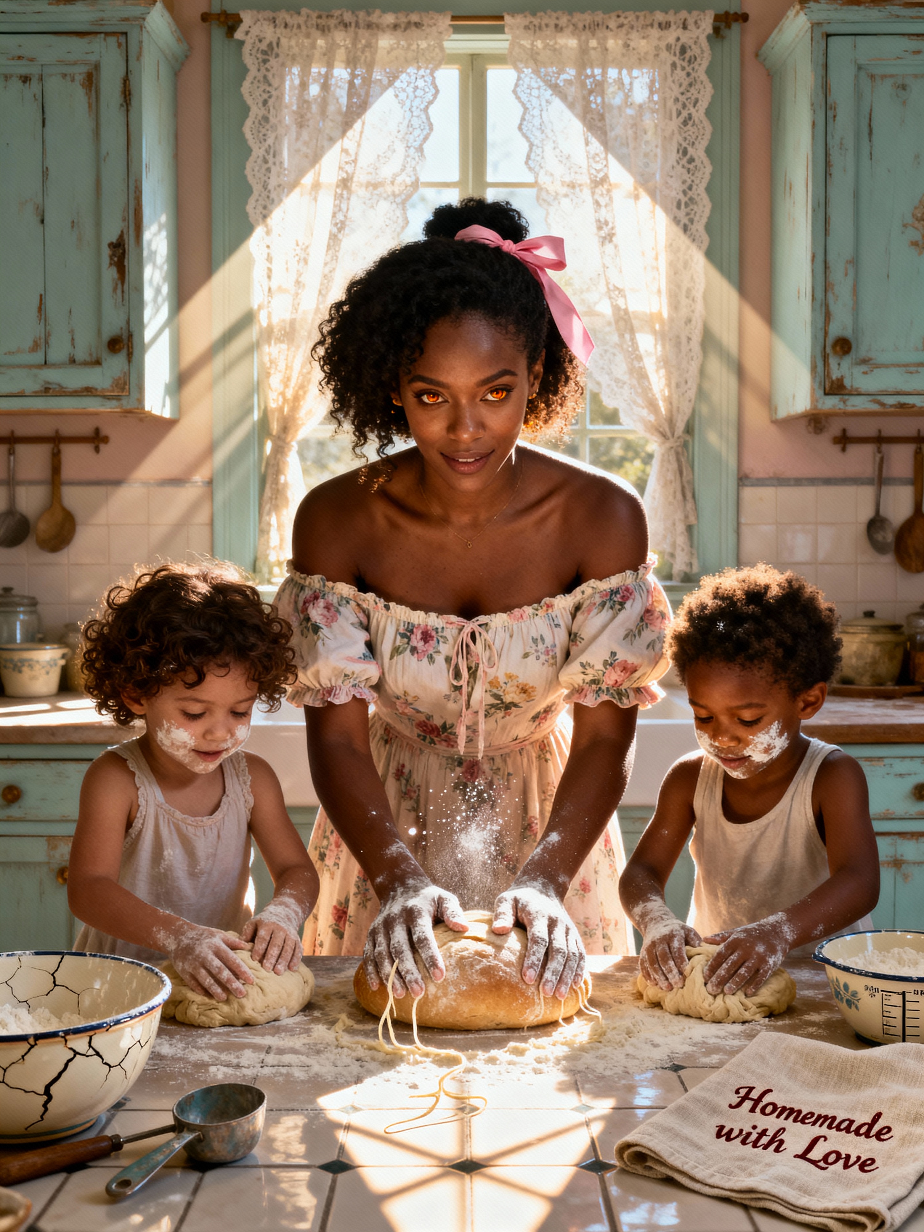 model in a quaint, pastel-painted kitchen baking homemade bread with her two young children helping knead dough, wearing a floral off-the-shoulder smocked dress, hair tied with a ribbon, flour on hands and children's faces