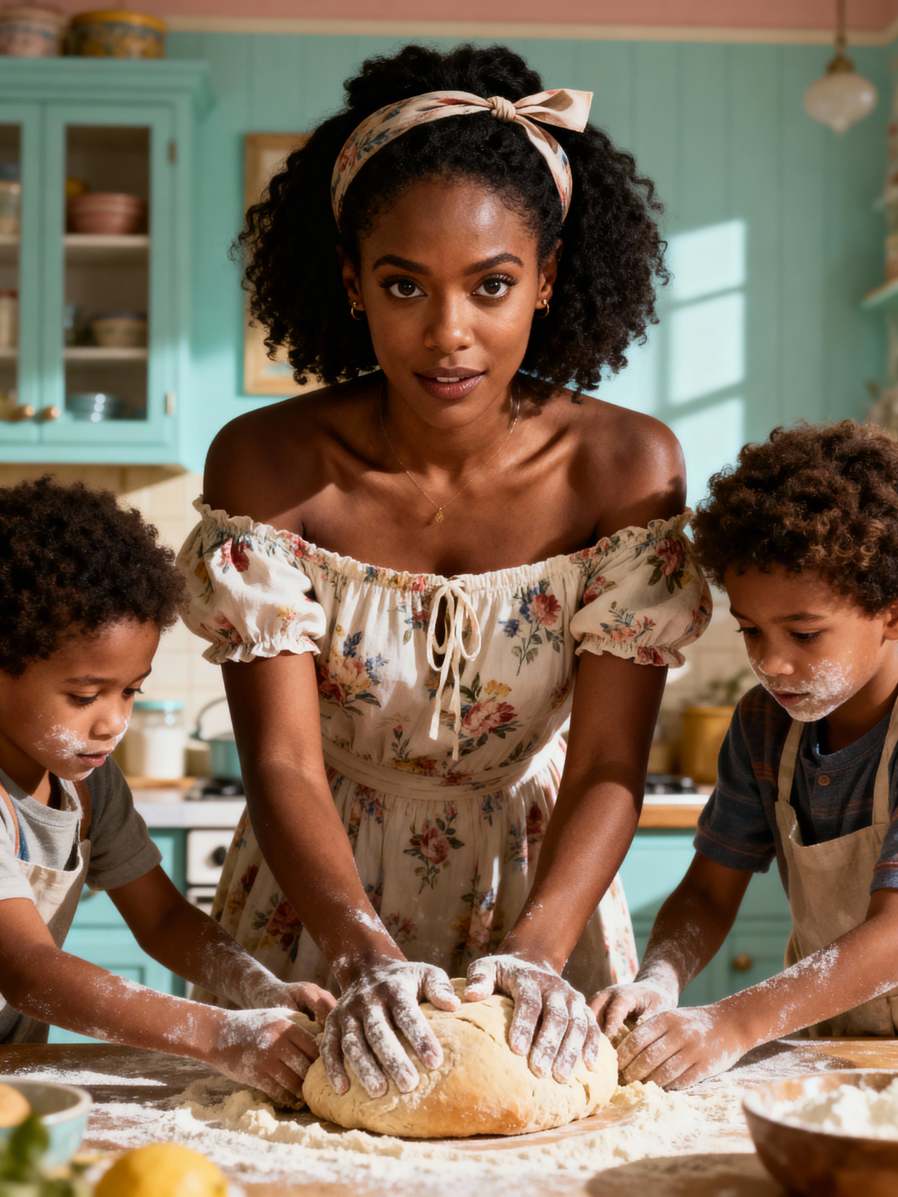 model in a quaint, pastel-painted kitchen baking homemade bread with her two young children helping knead dough, wearing a floral off-the-shoulder smocked dress, hair tied with a ribbon, flour on hands and children's faces