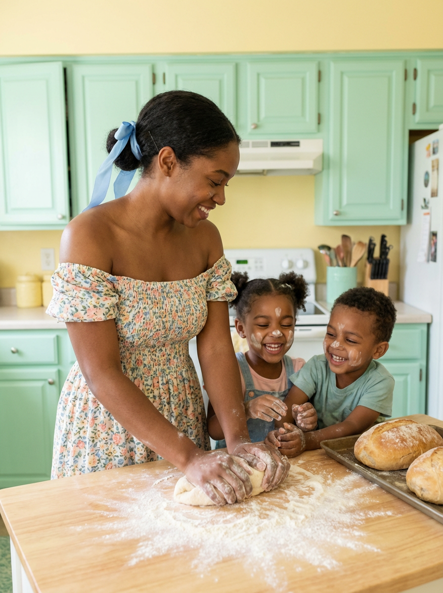 model in a quaint, pastel-painted kitchen baking homemade bread with her two young children helping knead dough, wearing a floral off-the-shoulder smocked dress, hair tied with a ribbon, flour on hands and children's faces