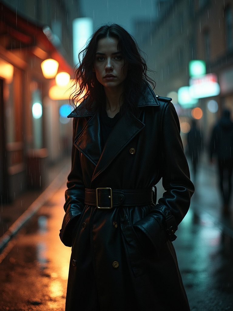 model in a rain-soaked city street at night, wearing a fitted trench coat with belt cinched at waist , dramatic shadows from street lamps, reflections in puddles, film noir high-contrast lighting, mysterious expression