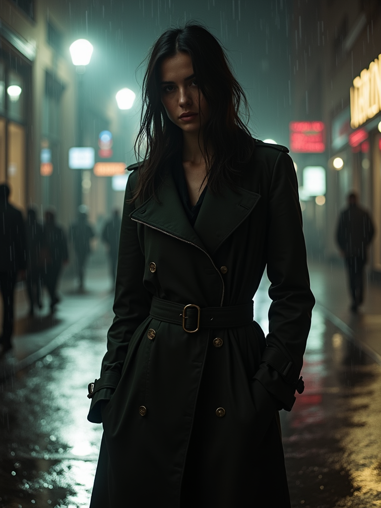 model in a rain-soaked city street at night, wearing a fitted trench coat with belt cinched at waist , dramatic shadows from street lamps, reflections in puddles, film noir high-contrast lighting, mysterious expression