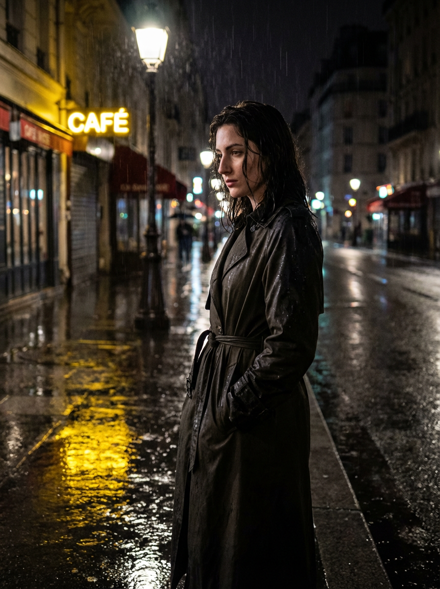 model in a rain-soaked city street at night, wearing a fitted trench coat with belt cinched at waist , dramatic shadows from street lamps, reflections in puddles, film noir high-contrast lighting, mysterious expression