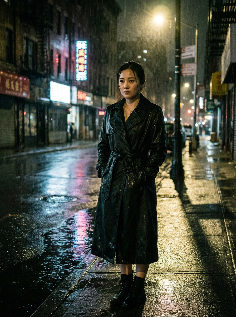model in a rain-soaked city street at night, wearing a fitted trench coat with belt cinched at waist , dramatic shadows from street lamps, reflections in puddles, film noir high-contrast lighting, mysterious expression