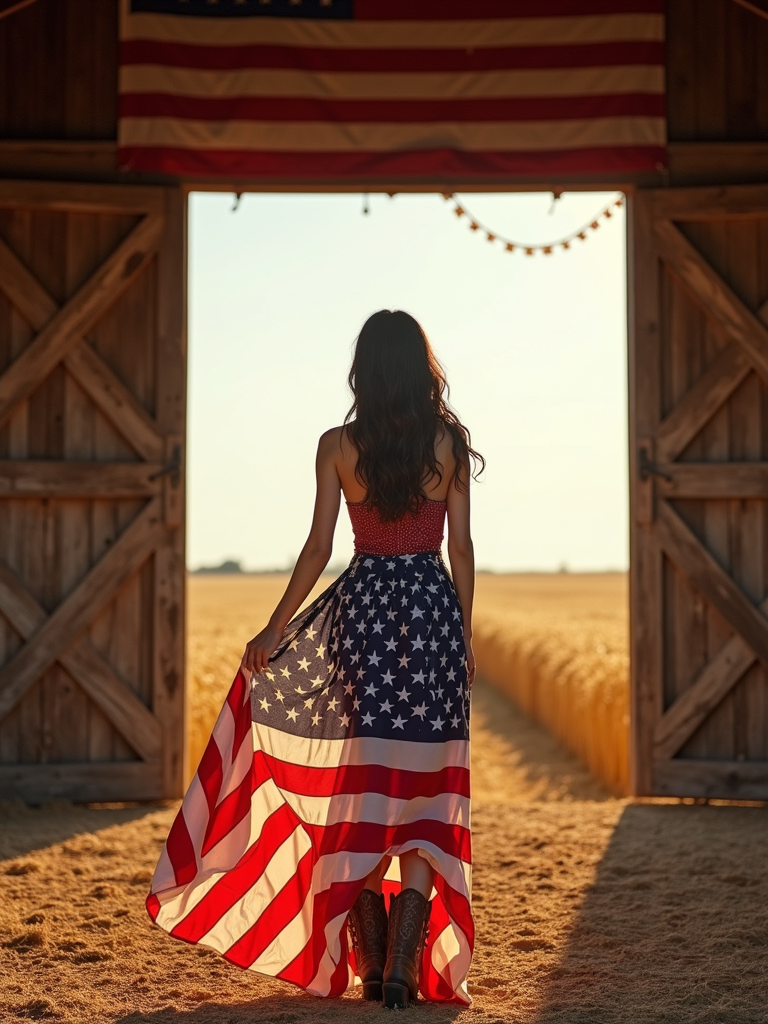 model in a rustic barn in America's heartland, wearing a stars and stripes dress with cowboy boots , standing beneath hanging American flags, golden wheat fields visible through the open doors, embodying rural American pride