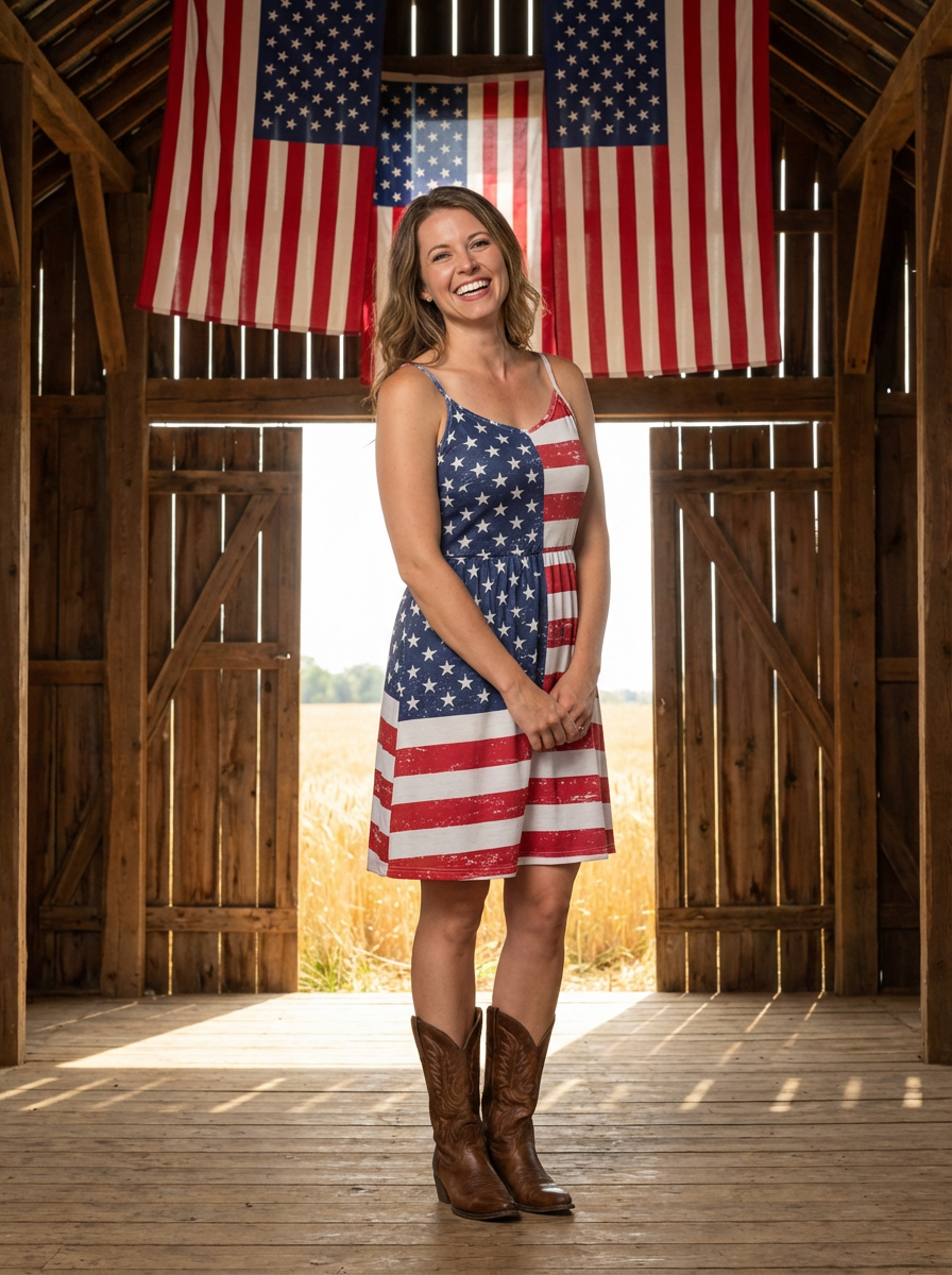 model in a rustic barn in America's heartland, wearing a stars and stripes dress with cowboy boots , standing beneath hanging American flags, golden wheat fields visible through the open doors, embodying rural American pride