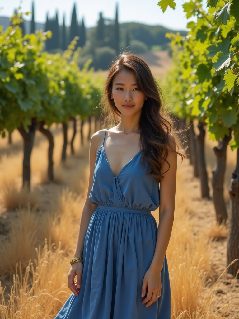 model in a rustic vineyard in Tuscany, wearing a blue sundress with gold accessories , standing beneath hanging grape vines, golden wheat fields and cypress trees visible in the background, embodying European rural charm