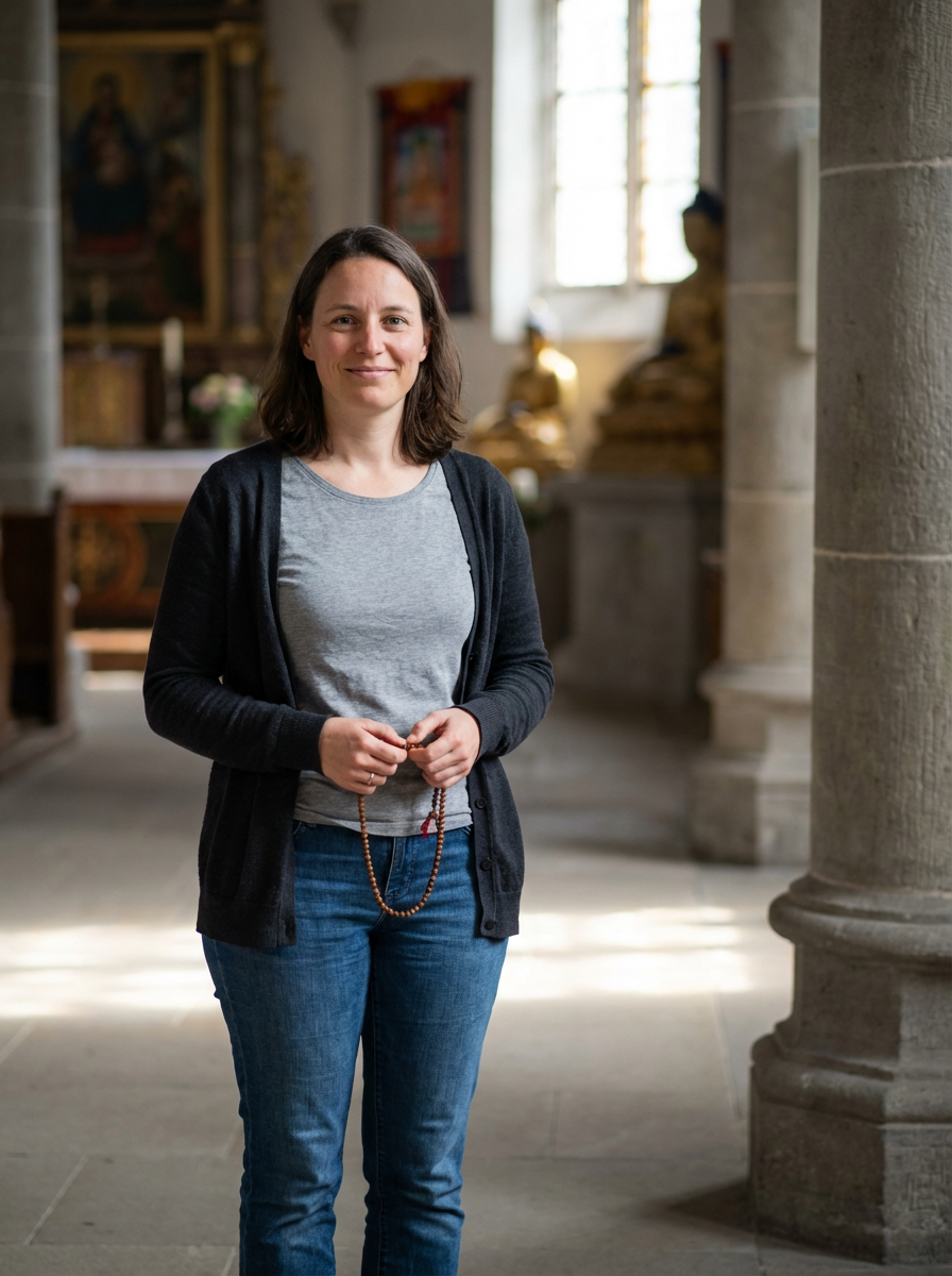 model in a serene temple or sacred space