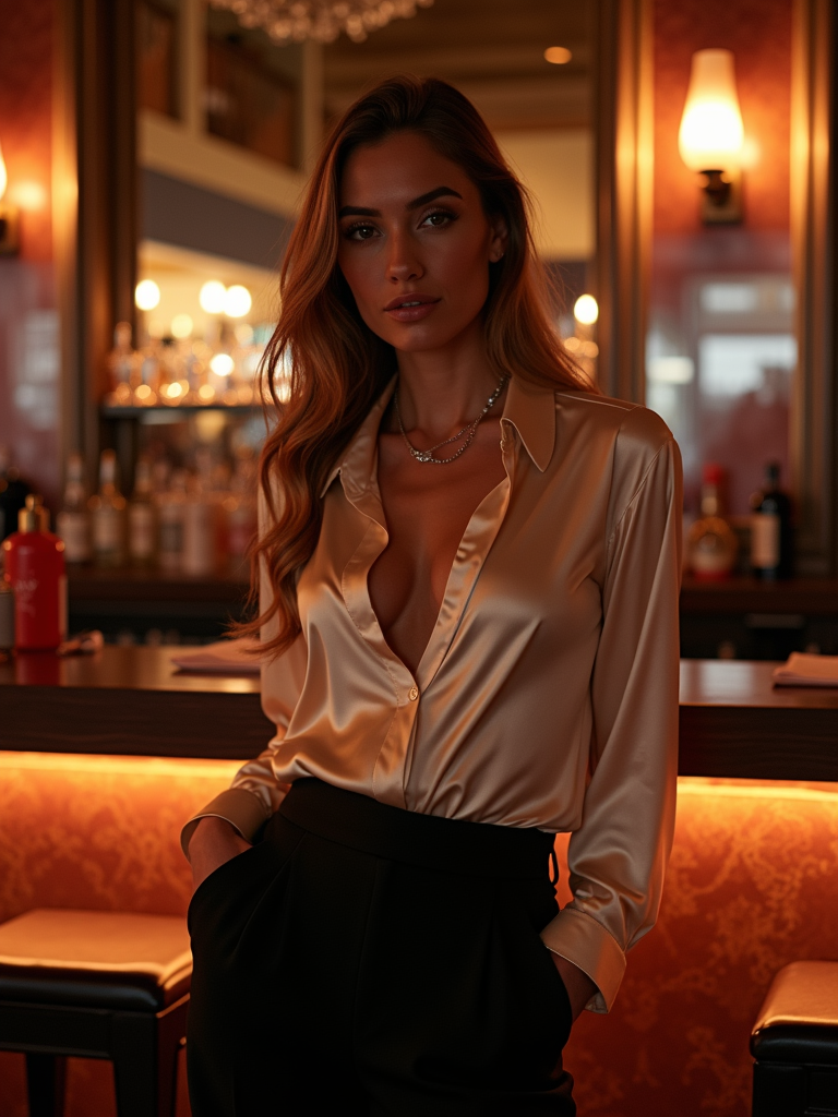 model in a stylish lounge bar with a glamorous ambiance. at night. the model wears a sophisticated evening outfit, such as a silk blouse and tailored pants.