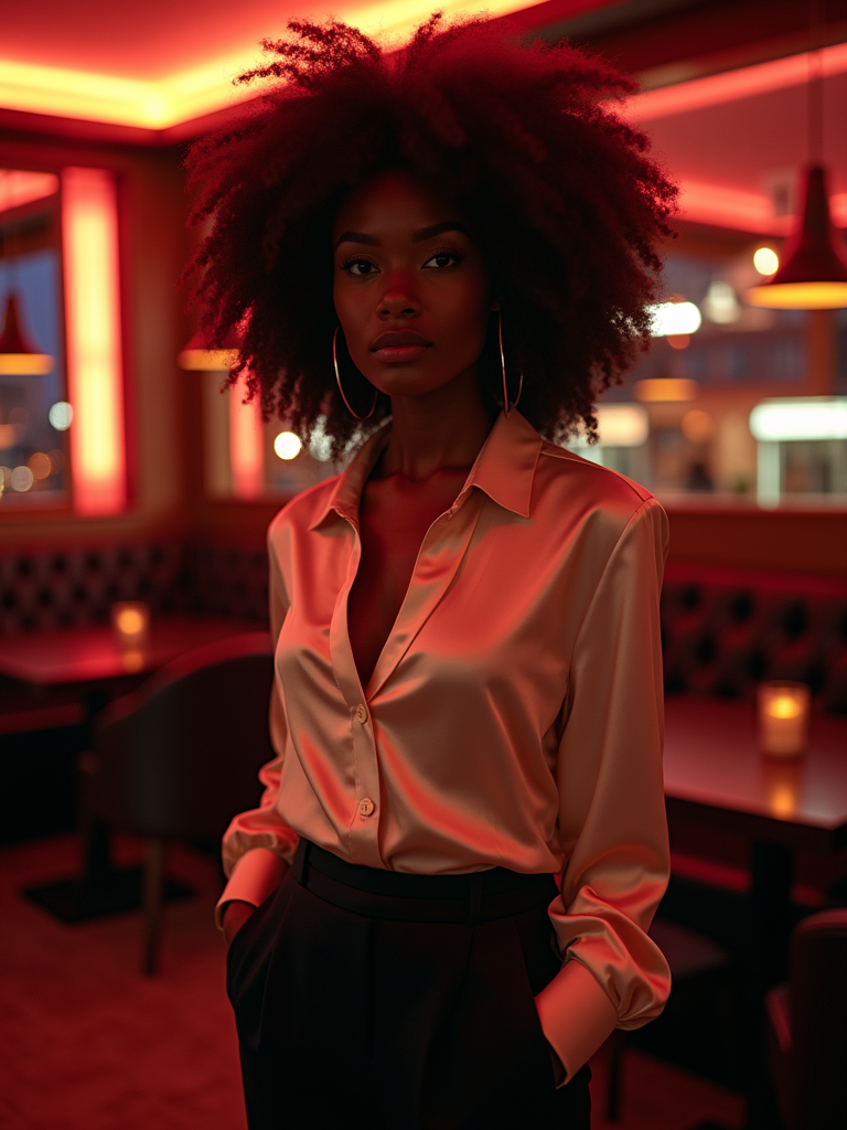 model in a stylish lounge bar with a glamorous ambiance. at night. the model wears a sophisticated evening outfit, such as a silk blouse and tailored pants.