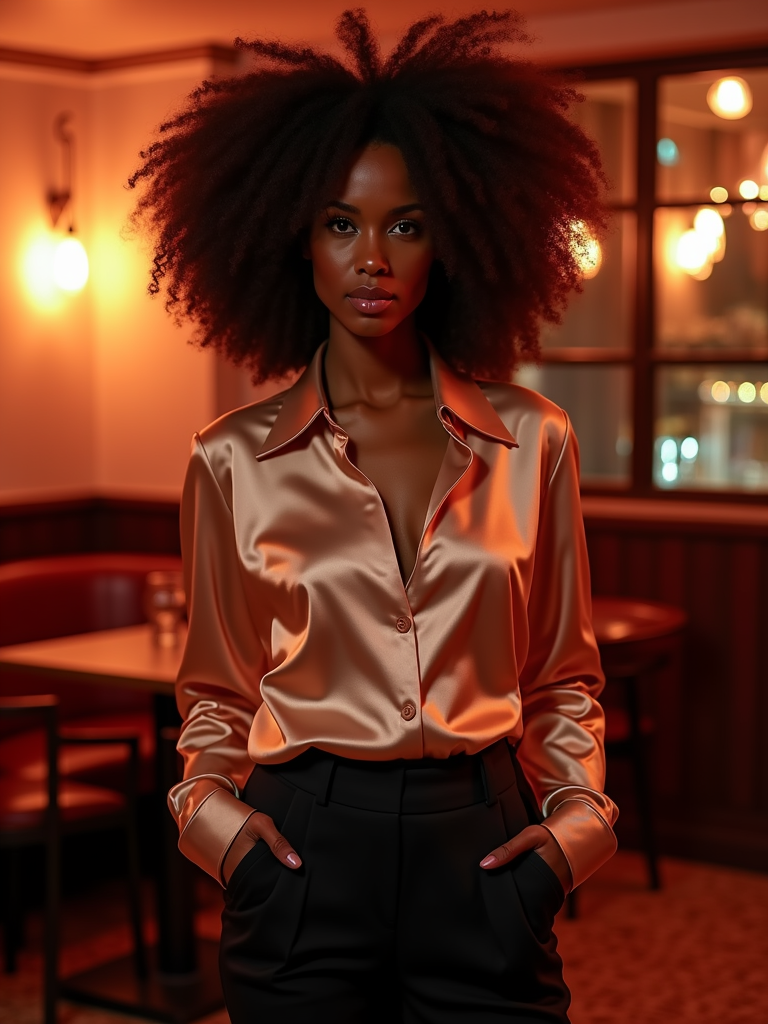 model in a stylish lounge bar with a glamorous ambiance. at night. the model wears a sophisticated evening outfit, such as a silk blouse and tailored pants.