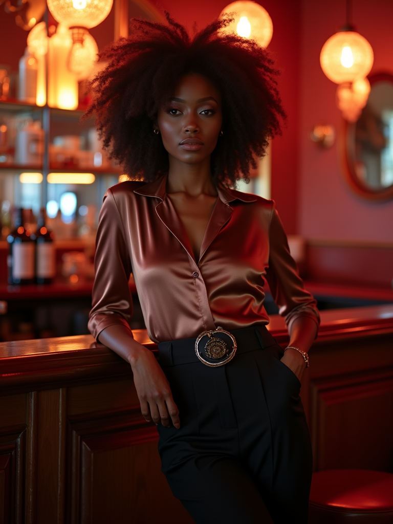 model in a stylish lounge bar with a glamorous ambiance. at night. the model wears a sophisticated evening outfit, such as a silk blouse and tailored pants.